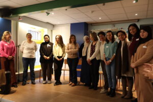 Loredana Marchi (directrice Foyer vzw), Paul Vanden Berghe (voorzitter Amfora vzw), Fadoua Bounour (Bachelor Student), Hamida Chikhi en Ann Trappers (Coördinator ICB Foyer) & Johan Leman (voorzitter Foyer vzw).